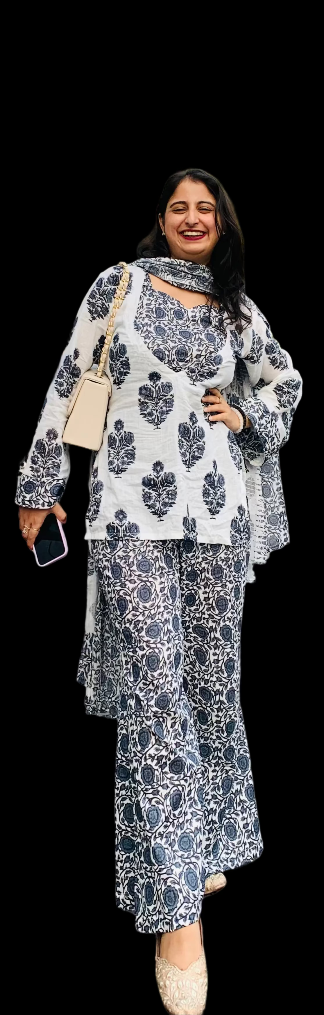 A SMOOTH BLEND OF FASHION AND CULTURE ENLIGHTENING THE MODEST TWIST OF ETHNIC WEAR. COMPRISES OF A 4 PC SET; A BUSTIER; A PAIR OF BELL BOTTOMS AND AN UPPER LAYERED SHORT KURTI EMBRACED WITH A COTTON DUPATTA. THIS PRINTED COTTON 4 PC SET IS A MUST HAVE THIS SUMMERS.
