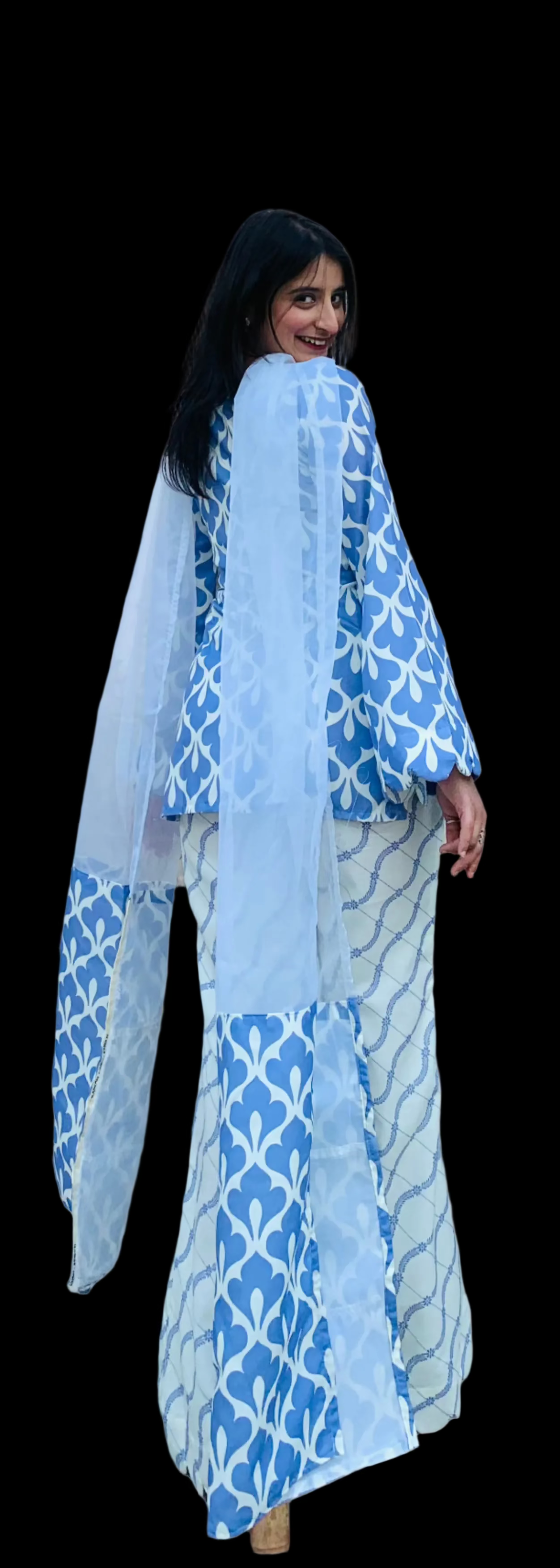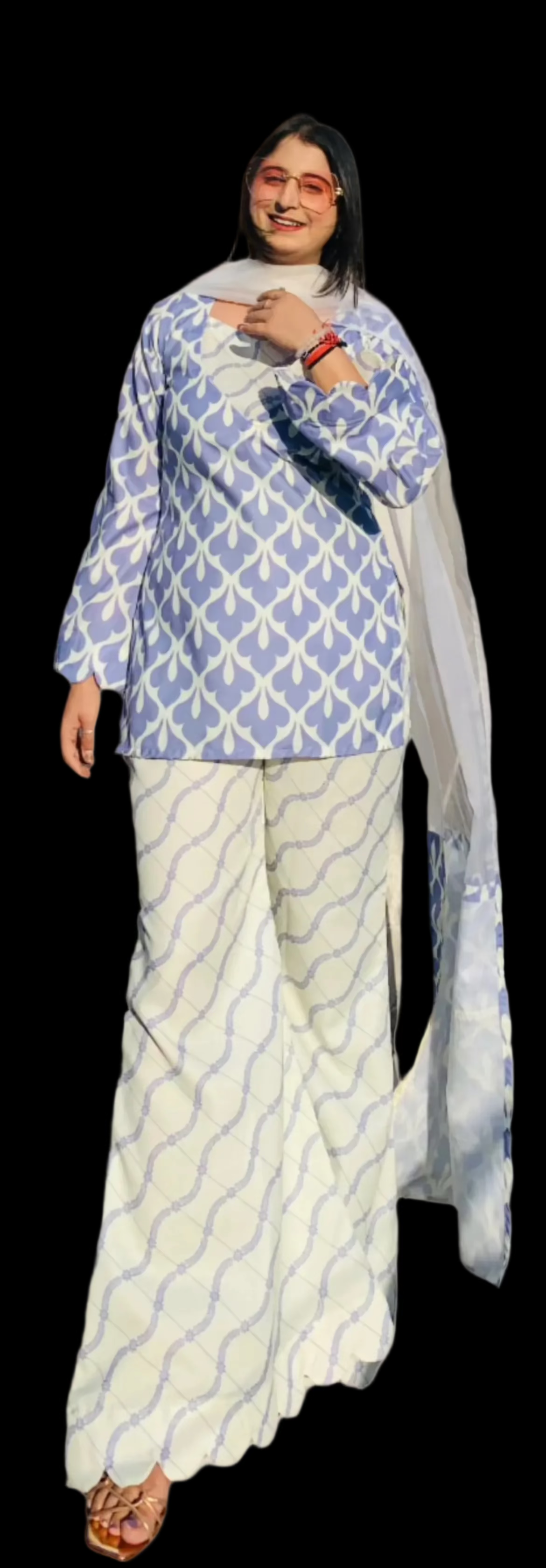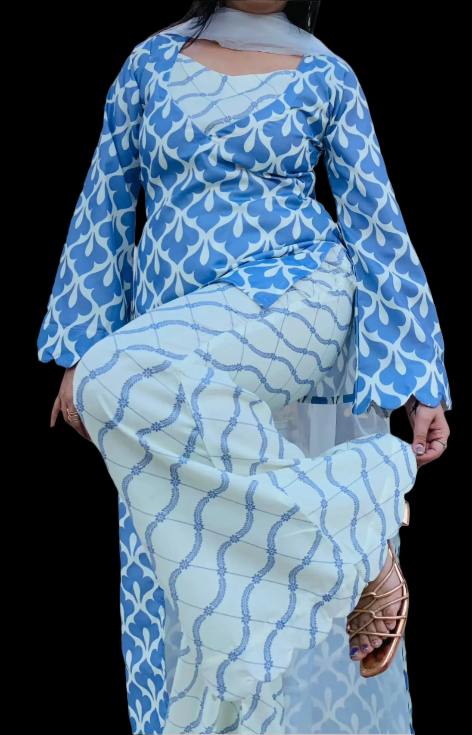 This 4-piece set of Honey Dual Complex features Organic cotton and a Digital Print. The stunning shade of Lilac, perfect for summers, adds an aesthetic touch to your outfit. Made with expert craftsmanship and quality materials, this set is definitely a Steal Deal. This 4 piece set of Honey Diagonal Digital Flip features an organic cotton material for a comfortable and environmental-friendly option. The digital print adds a unique twist, with a diagonal flip design that sets it apart from traditional prints. Finished off with bell bottom pants & Fine organza dupatta with broad borders ; this set is both stylish and sustainable.