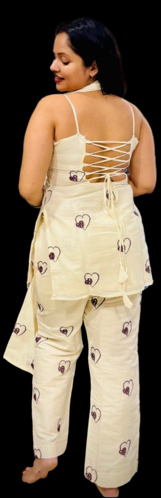 Crafted from organic khaadi cotton with a soft cotton lining, the Honey Heartsy Bliss offers breathable comfort and natural elegance. Featuring delicate dori details on the neckline and back, complemented by a corset-style back for a customized fit, this ensemble is paired with straight pants for a balanced silhouette. Ideal for a refined, girlish look that blends tradition with modern tailoring.