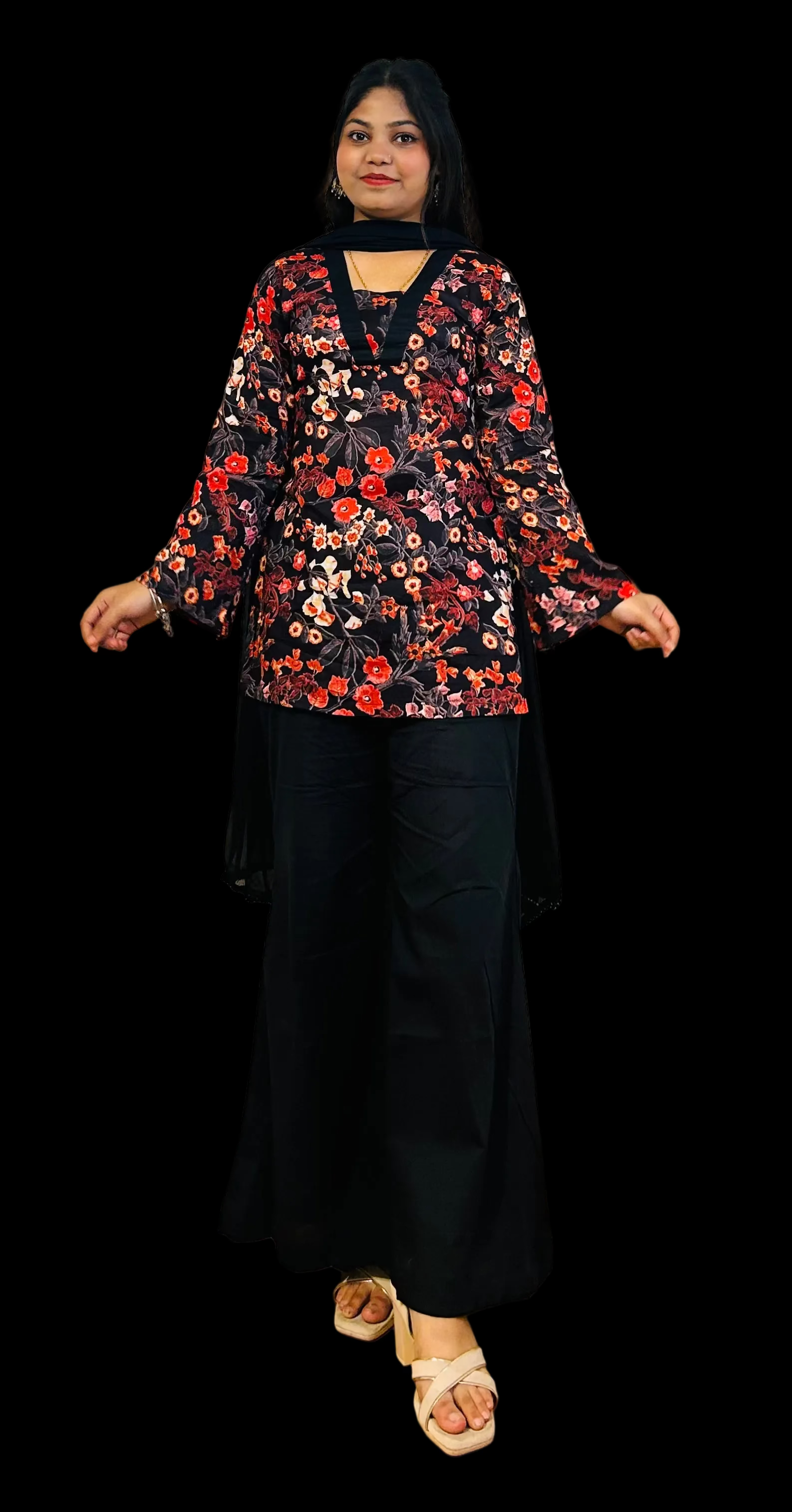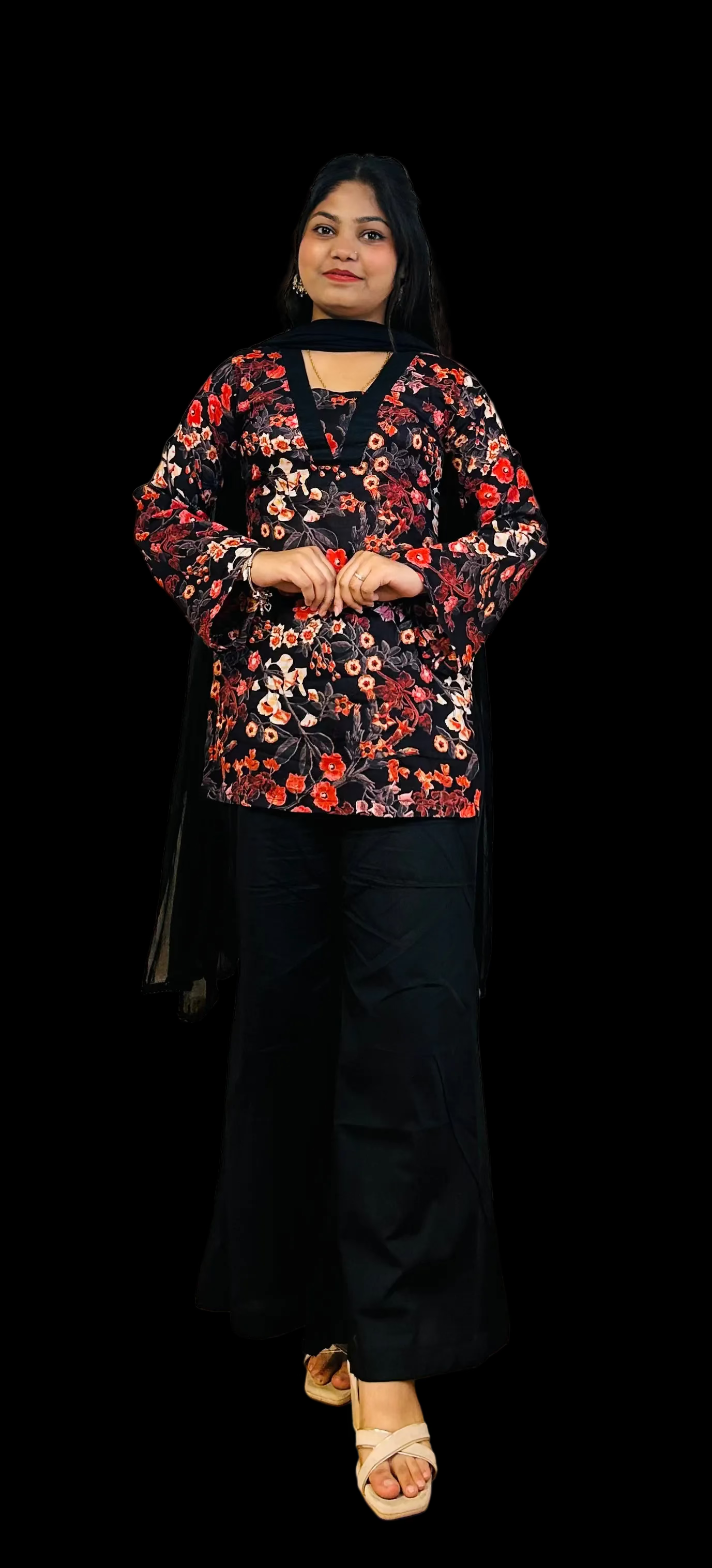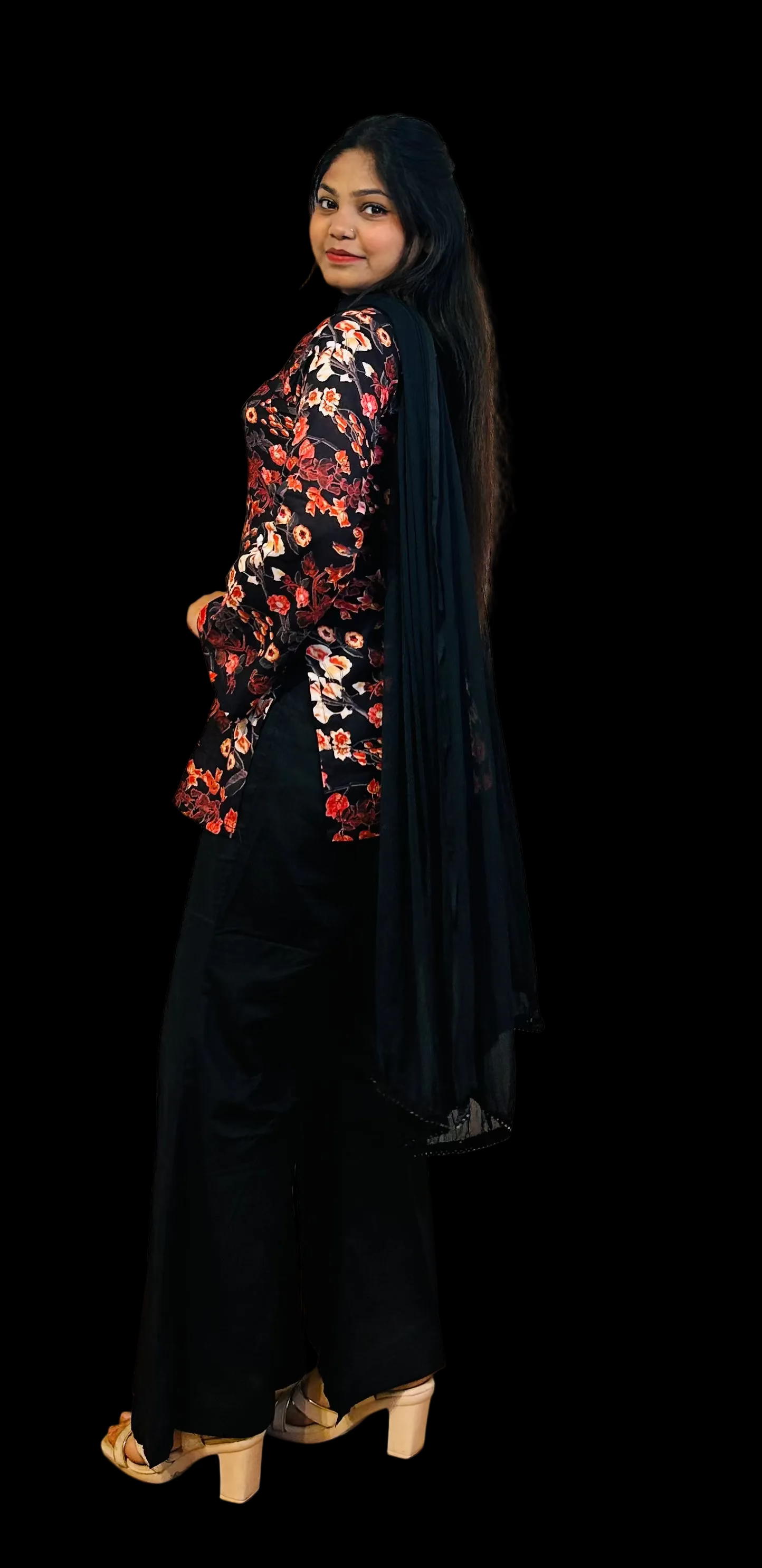 The Honey the Floral Glitch 3-Piece Premium Set combines traditional elegance with contemporary design. This curated ensemble features a beautifully crafted kurti in premium 60-60 cotton blend, paired with gracefully flowing bell-bottom trousers in the same superior fabric for comfort and breathability. Complemented by a luxurious pure chiffon dupatta, this set delivers versatility for both casual and festive occasions. The premium cotton ensures durability and easy maintenance, while the chiffon dupatta adds an ethereal dimension to your ensemble. The cohesive floral glitch motif across all three pieces creates a sophisticated, coordinated aesthetic that reflects refined taste and contemporary sensibility.