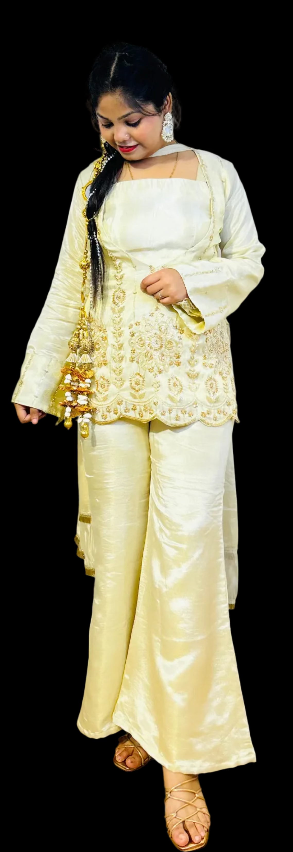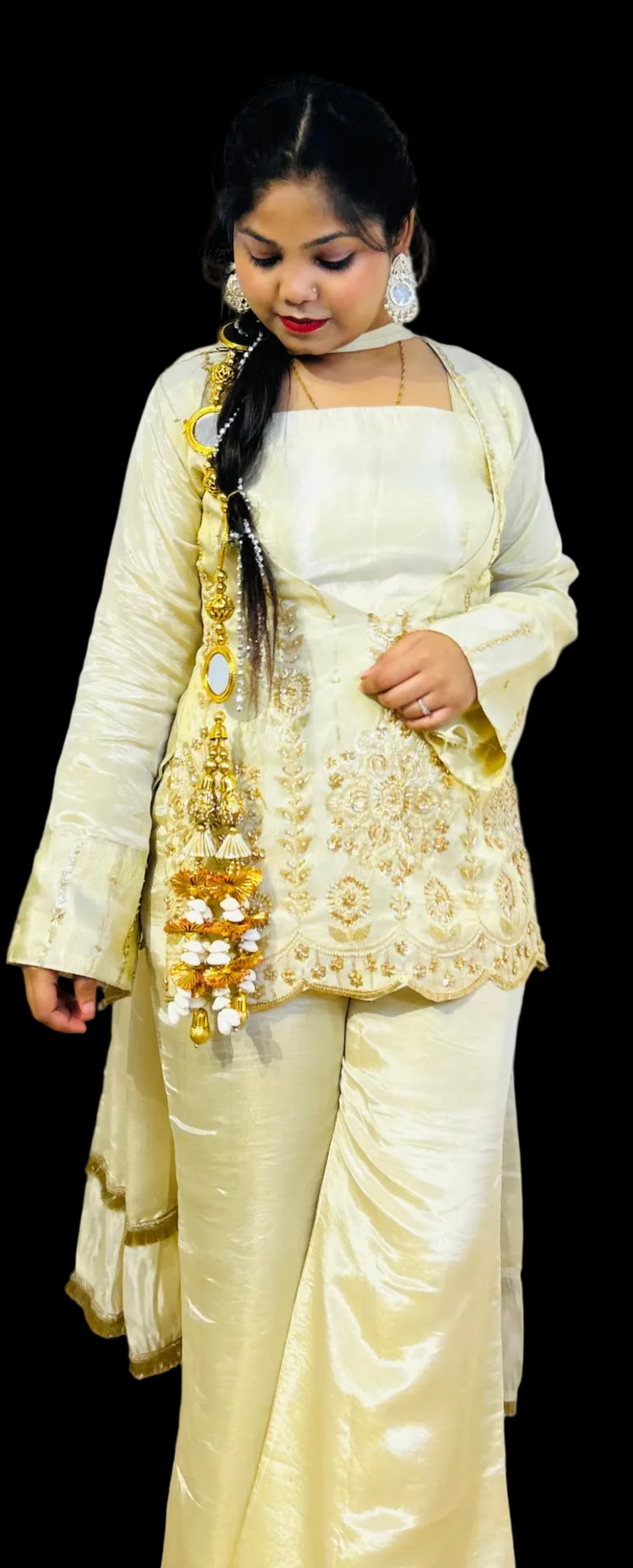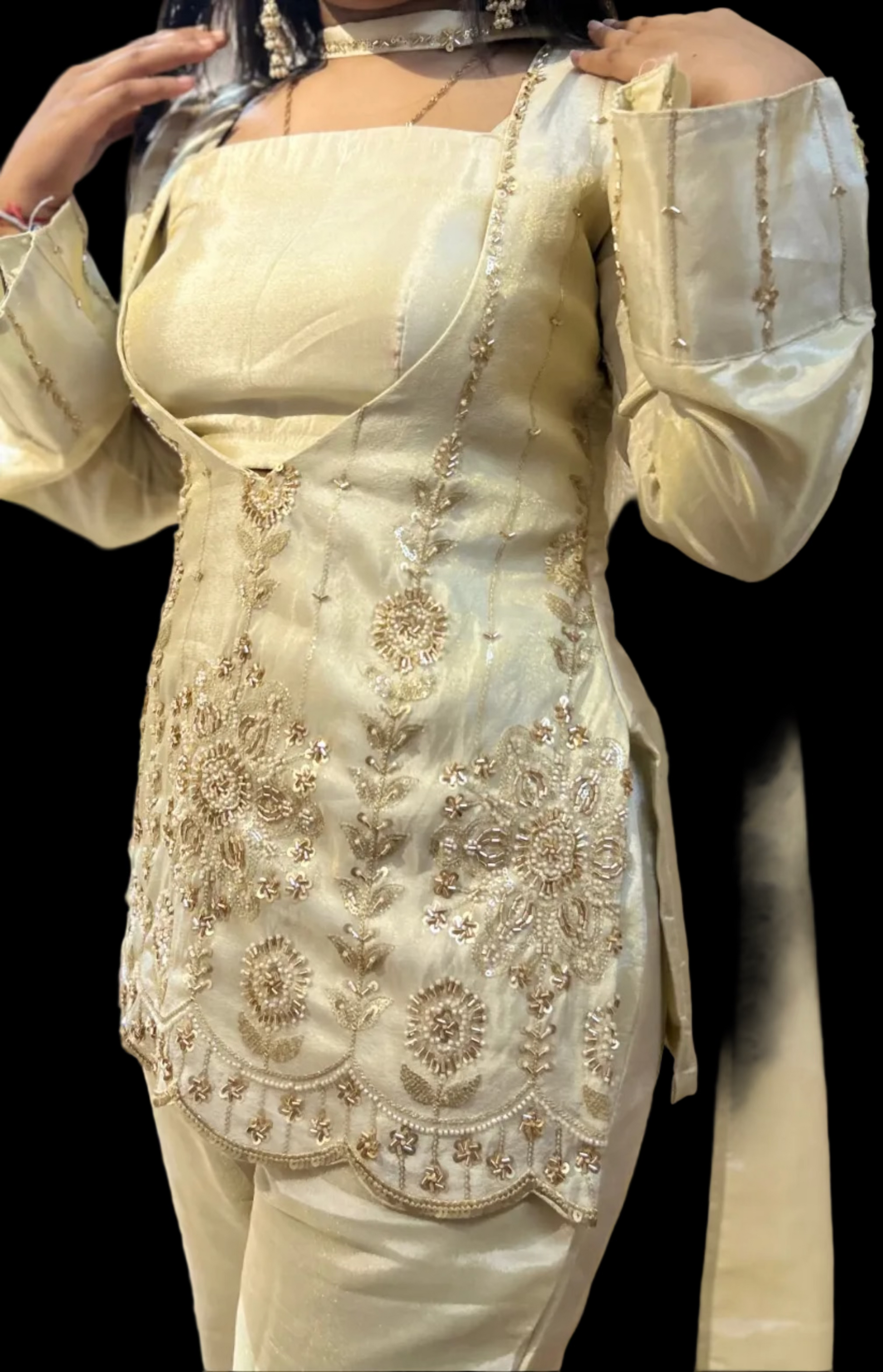 Elevate your party wardrobe with this sophisticated 4-piece ensemble crafted from luxurious cosmos silk. The intricately embroidered upper panel showcases refined artistry, while the coordinating dupatta features delicate kinari lace detailing for an added touch of elegance. Perfect for festive occasions and formal gatherings, this set combines traditional craftsmanship with contemporary design sensibilities. The premium fabric drapes beautifully, ensuring comfort throughout your celebration while maintaining an impeccable, polished appearance.