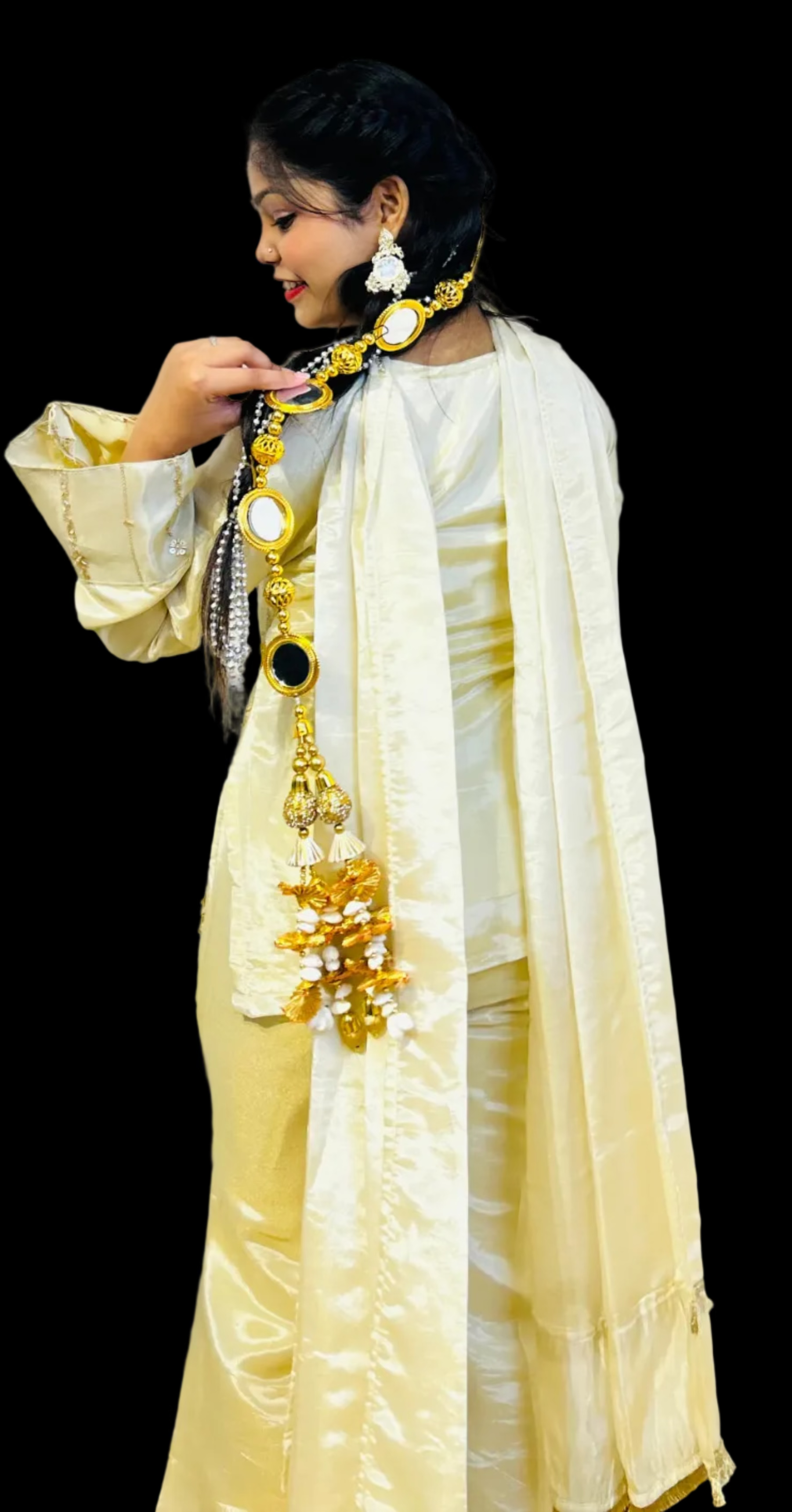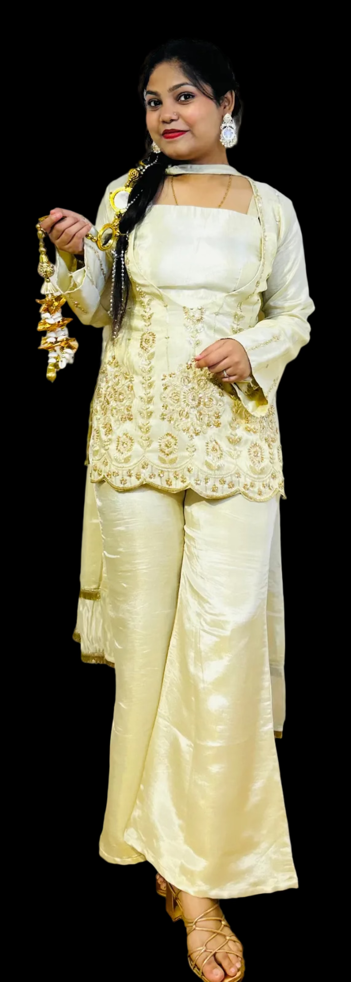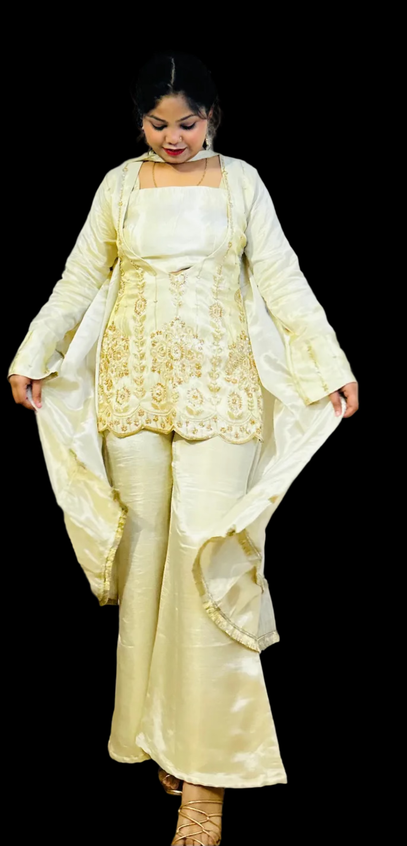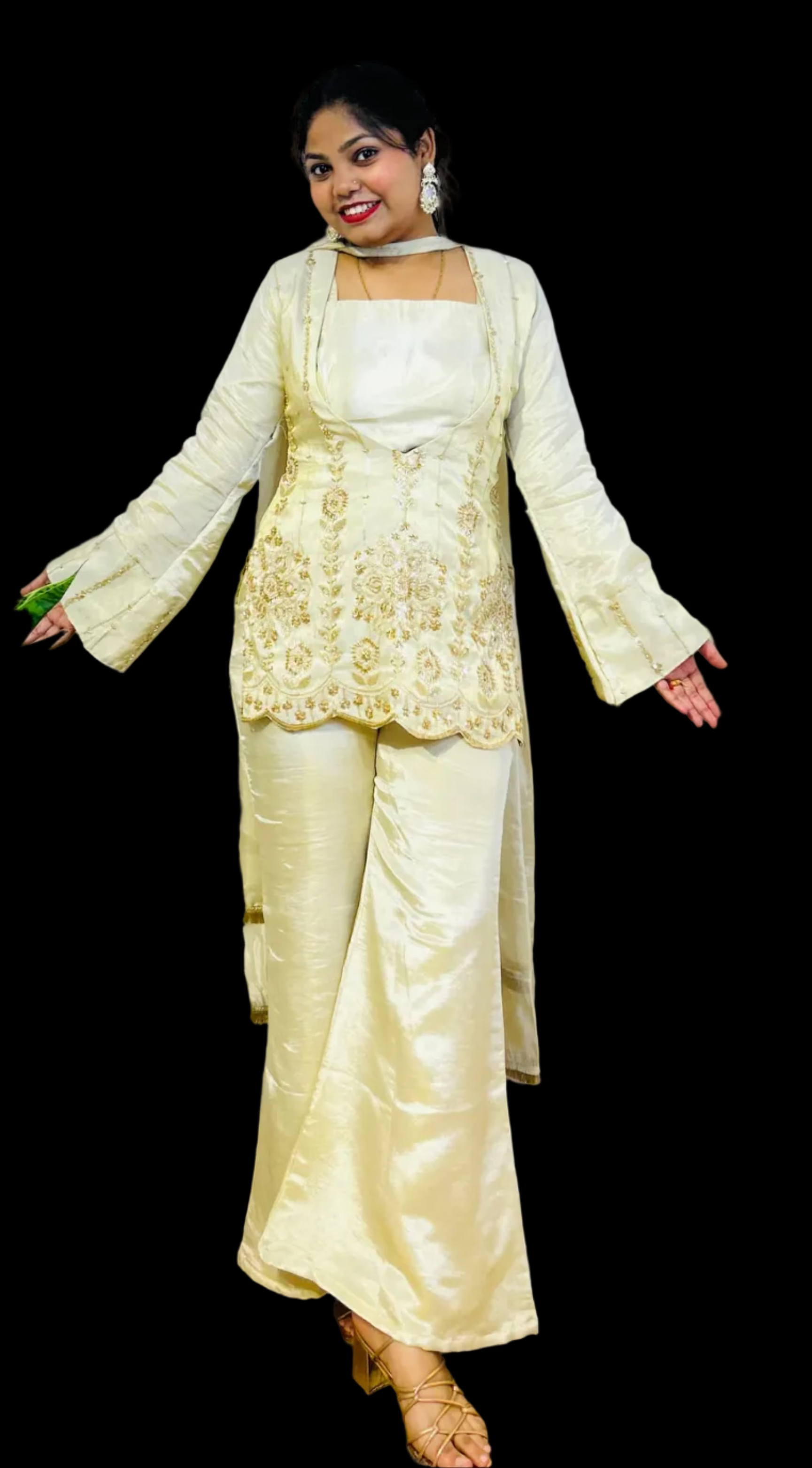 Elevate your party wardrobe with this sophisticated 4-piece ensemble crafted from luxurious cosmos silk. The intricately embroidered upper panel showcases refined artistry, while the coordinating dupatta features delicate kinari lace detailing for an added touch of elegance. Perfect for festive occasions and formal gatherings, this set combines traditional craftsmanship with contemporary design sensibilities. The premium fabric drapes beautifully, ensuring comfort throughout your celebration while maintaining an impeccable, polished appearance.
