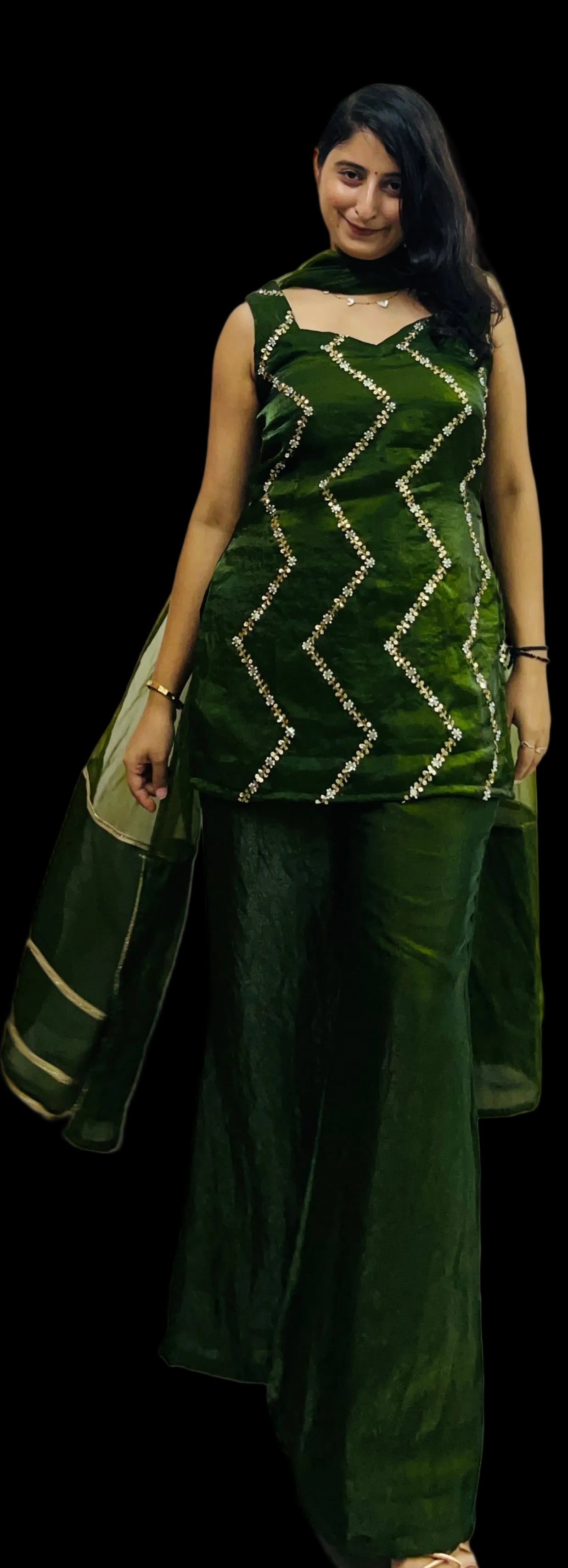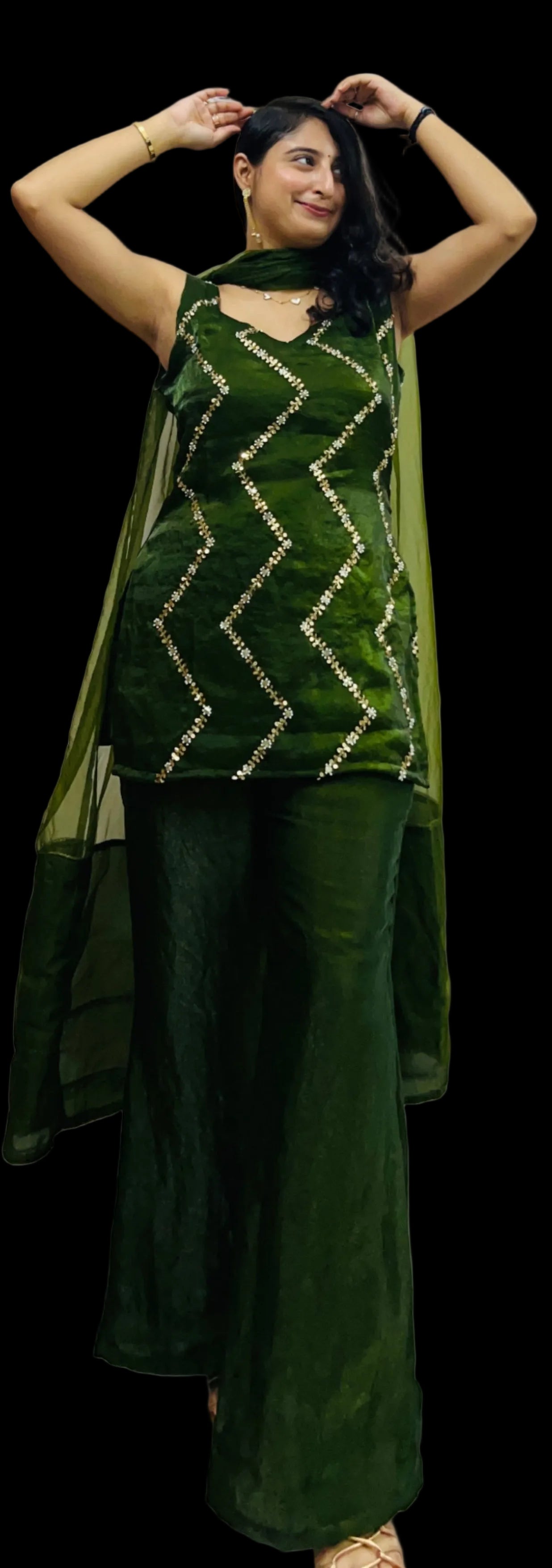 Experience timeless elegance with this 3-piece 90s-inspired outfit crafted from luxurious Fendi silk. Featuring complete katdana embroidery with internalised cotton lining for comfort and an exquisite organza dupatta, this set combines classic design with premium fabrics to offer a sophisticated and breathable ensemble perfect for special occasions.
