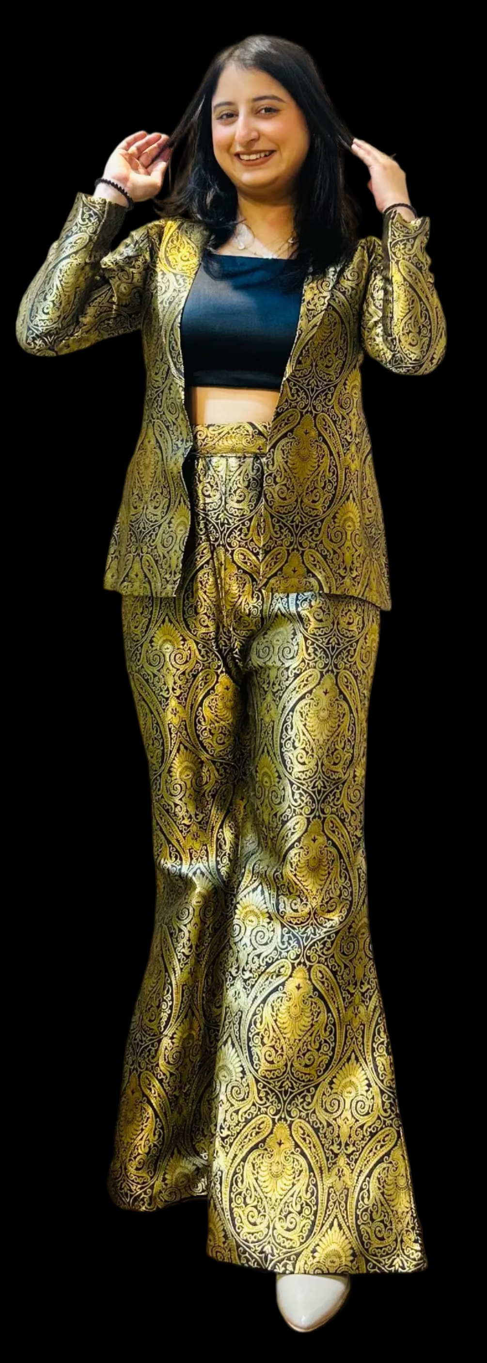 Elevate your wardrobe with this sophisticated three-piece ensemble featuring a premium brocade silk blazer that commands attention. The intricately patterned blazer pairs seamlessly with tailored bellbottom trousers, creating a striking silhouette that bridges classic elegance with contemporary style. A sleek black bustier completes the set, offering versatility for layering or standalone wear. Crafted from quality brocade silk, this coordinated collection delivers refined texture and lustrous finish, perfect for making a statement at upscale events, professional gatherings, or fashion-forward occasions. The urban edge aesthetic ensures you stand out with confidence and poise.