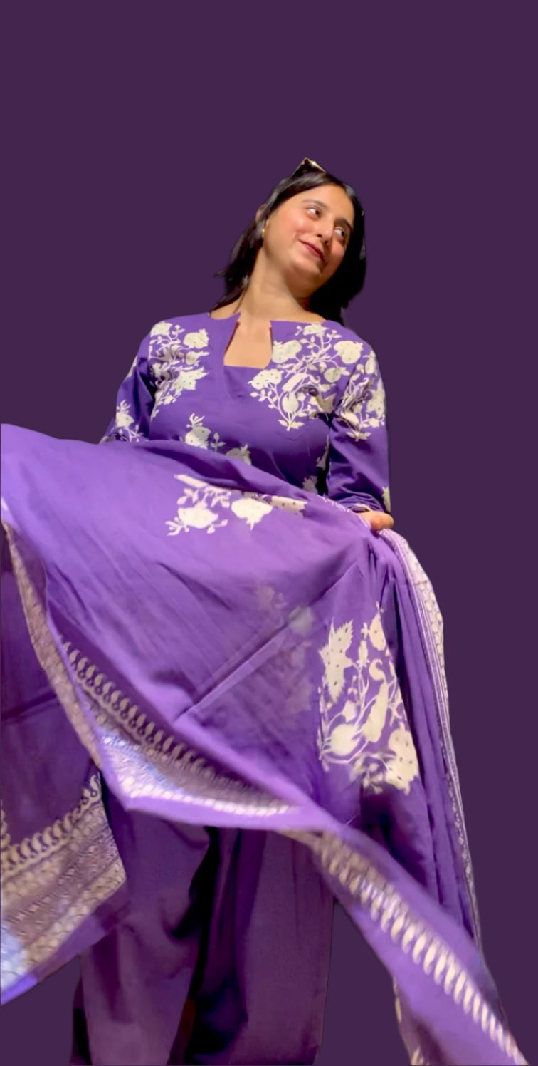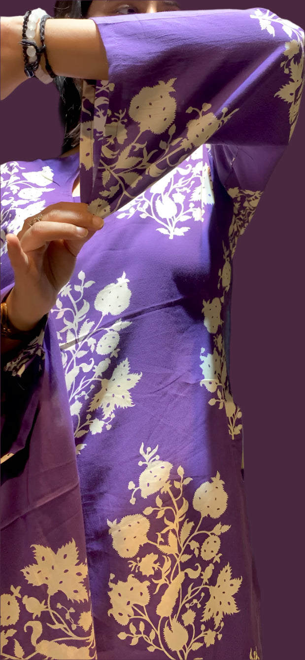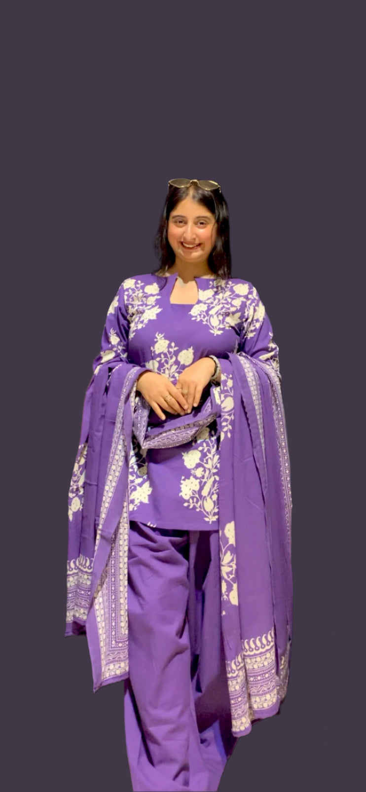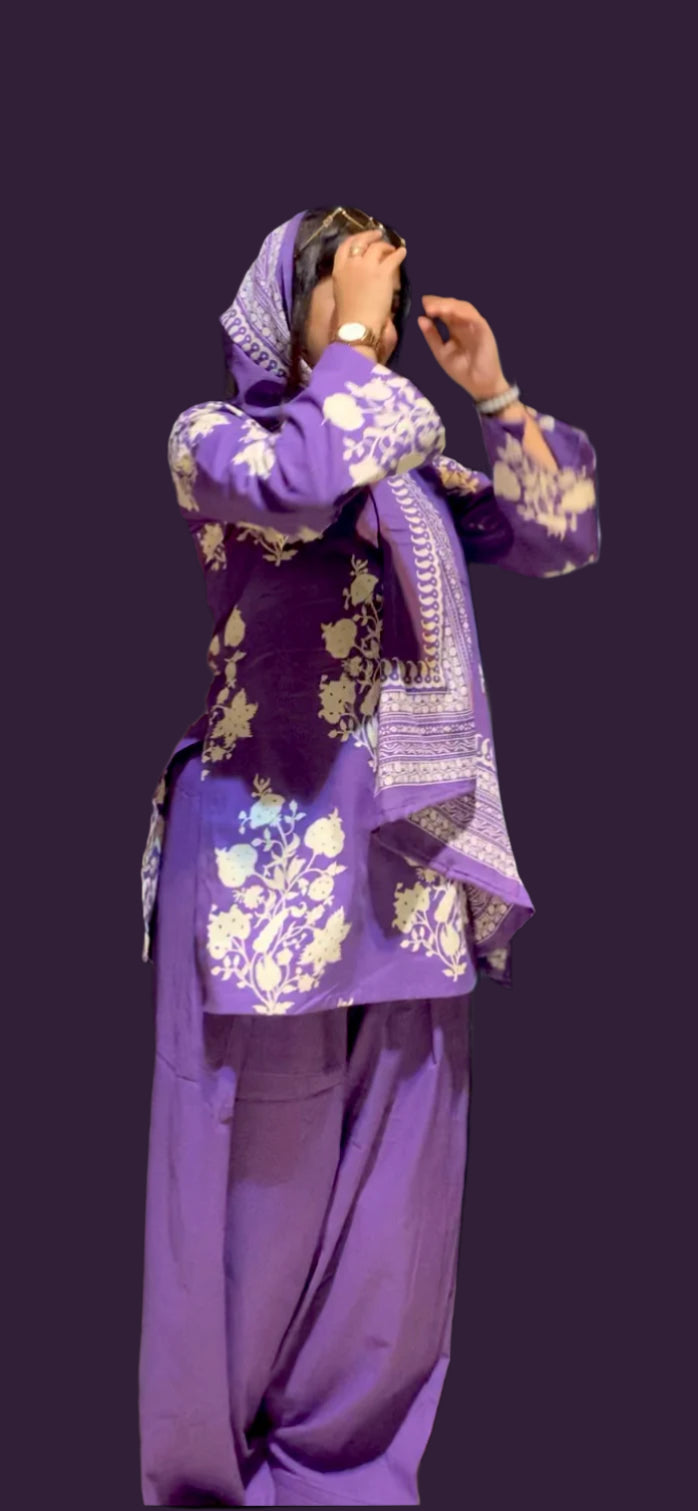 Crafted from organic cotton, the Honey Voilet Farshi Hues features exquisite intricate detailing paired with traditional Fashi salwar and authentic Pakistani-style sleeves. This ensemble offers breathable comfort and elegant style, making it an ideal choice for warm summer days.
